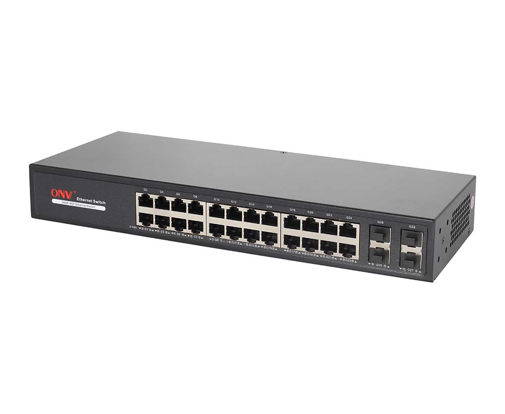 The ONV-H3028FB is a Gigabit Ethernet switch independently developed by ONV. It has 4*1000Base-X uplink SFP fiber ports and 24*10/100/1000Base-T adaptive RJ45 ports. The RJ45 and SFP fiber combined port can be unaffected by the transmission medium, realizing convenient connection and expansion of the network. The scheme of the large backplane and large cache switching chip is preferred to improve the forwarding rate of large files and effectively solve the problems of video freeze and picture loss in the high-definition surveillance environment. It is suitable for hotels, banks, campuses, factory quarters, and small and medium-sized enterprises to establish a cost-effective network. Unmanaged mode, plug and play, no configuration, simple and convenient to use.