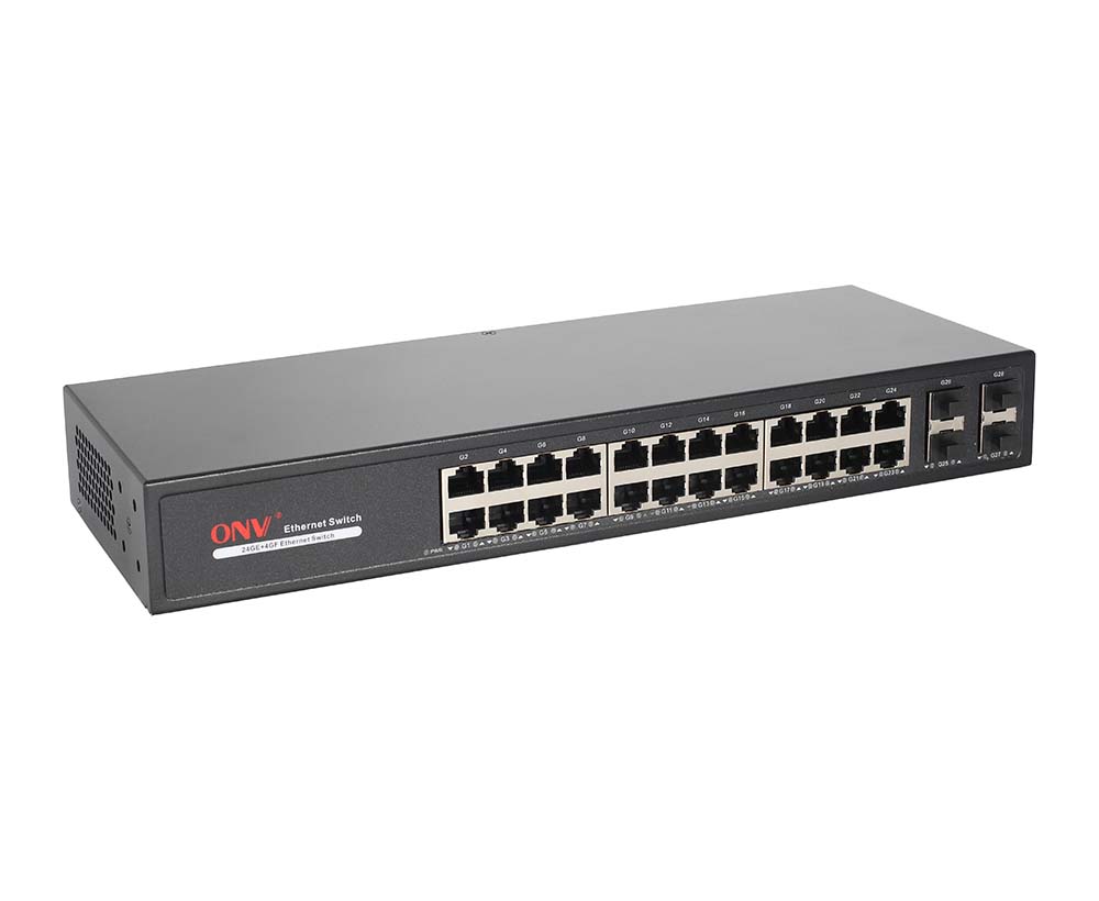 The ONV-H3028FB is a Gigabit Ethernet switch independently developed by ONV. It has 4*1000Base-X uplink SFP fiber ports and 24*10/100/1000Base-T adaptive RJ45 ports. The RJ45 and SFP fiber combined port can be unaffected by the transmission medium, realizing convenient connection and expansion of the network. The scheme of the large backplane and large cache switching chip is preferred to improve the forwarding rate of large files and effectively solve the problems of video freeze and picture loss in the high-definition surveillance environment. It is suitable for hotels, banks, campuses, factory quarters, and small and medium-sized enterprises to establish a cost-effective network. Unmanaged mode, plug and play, no configuration, simple and convenient to use.